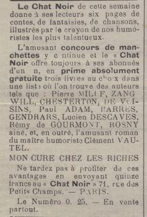 Une Tempête dans un Encrier Nombre d’envieux ou d’ignorants prétentieux ont attaqué, dernièrement, dans notre grande presse, la cinématographie. Ceci est de peu d’importance. Mais, voici que M. Rémy de Gourmont, en son papier quotidien de La France, nouveau Chevalier de la Triste Figure, rompt des lances sur notre échine. La compétence littéraire, l’érudition honnête de cet écrivain et le sérieux normal de son argumentation ne nous laissaient pas supposer qu’un jour M. de Gourmont serait à ce point irascible. Voici qu’il vitupère contre le cinématographe, en un style emprunté à la polémique électorale. Notre cher critique est en colère. Agité d’un trouble inquiétant, il jette sur nous l’anathème. « L’abus du cinématographe, même de la variété dite instructive, ne semble pas devoir agrandir beaucoup les intelligences ». Ainsi, les panoramiques de voyages, les films scientifiques, les résurrections historiques sérieuses ne valent pas les petits papiers quotidiens où M. de Gourmont, délaissant sa philosophie légèrement amère du Mercure de France, délaie pour le bon public des vérités faciles qui eussent ravi M. de La Palisse. « Quant au cinéma dramatique et, si l’on peut dire, littéraire, il est une parfaite école d’ahurissement ». Il est évident que le fin styliste qui nous dota de La Culture des idées ne pouvait qu’exprimer aussi galamment son mépris pour notre art inférieur. Il nous étonne même qu’il ait daigné descendre de sa hautaine tour d’ivoire pour venir contempler nos bas spectacles. Homme de lettres, M. de Gourmont a parfaitement raison de chérir son art, néanmoins, qu’il nous permette d’avoir, nous aussi, nos amours. L’action dramatique animée nous apparaît réaliser le maximum de vie désirée. Le cinéma nous semble pouvoir créer parfaitement des œuvres romanesques, ajoutant au mouvement des êtres la lumière et le pittoresque des climats où ils vivent. L’œuvre d’art ne naît pas, uniquement, à notre humble avis, dans un encrier. M. de Gourmont reproche au cinématographe sa vitesse, « son amas de gestes peu cohérents ». Dans un film, les foules agitées par une colère violente devraient, pour satisfaire au désir de l’écrivain, évoluer rythmiquement à la manière de ces défilés d’opéra-comique où de jeunes marmitons traversent la scène d’un pas mesuré et les gestes de terreur ou de joie des personnages gagneraient certainement à avoir la sobriété des marion[n]ettes. Et M. de Gourmont conseille à ses lecteurs de ne pas aller voir au cinéma Les Ronds-de-cuir : « Il en reste, dit-il, une impression de la farce la plus grossière et même la plus sotte ». Pour être isolé, cet avis n’en est pas moins ridicule. Le public n’a nul besoin du conseil intéressé des pontifes pour estimer une œuvre. Les Ronds-de-cuir ont amusé les uns et les autres en ce qu’ils sont une élégante satire de nos institutions. L’éditeur de ce film n’a point trahi l’auteur de ce beau livre, lequel a bien voulu manifester lui-même sa joie de contempler à l’écran l’héroïque Le Tondu, un de ses enfants terribles. Mais M. Gourmont, dont le métier est de professer la sagesse, n’a pas suivi les lois de la sagesse proverbiale. En l’occurrence, il fut plus royaliste que le roi. Le cinématographe a un tort évident, encore que notre esthéticien ne l’avoue pas, c’est de ne point adapter ses petits-discours philosophiques. Gageons que le jour où nous verrons du Rémy de Gourmont à l’écran, le critique de La France se laissera attendrir. Ce qu’il importe de voir, derrière ces luttes esthétiques, c’est le mobile intéressé qui les suscite. Sous couvert de défendre les belles-lettres, il se mène, actuellement, contre le cinématographe, une lutte d’appétits. Nous savons que M. de Gourmont ne s’embarrasse pas de vaines questions réalistes et que sa carrière heureuse l’élève au-dessus de certaines questions d’intérêt. Néanmoins, inconsciemment, il s’est fait l’apôtre d’un certain groupe. Sa voi[x] autorisée en matière littéraire est le pavillon flamboyant sous lequel se cachent de mauvais marchands, dramaturges dont la lyre n’est plus qu’une tyre-lire, écrivains obscurs et prétentieux qui rêvent rien moins que d’exercer une sorte de dictature intellectuelle, nous n’avons pas dit intelligente, sur notre industrie florissante. Gabriel-Tristan Franconi, Film-Revue, 25 mai 1914, p. 14-15. 1er avril 2025 Le cauchemar du biographe (suite du 13 février). Dans " Amitiés ", petit épilogue paru dans La France du 21 juillet 1914, Gourmont ne signale que l'existence d'un lapin vivant en bonne intelligence avec les chats. A suivre. Lettre de Gourmont à Elskamp, communiquée par Laurent Six : 17 février 2025 Gourmont-Ponge « Erreurs de Gourmont sur la décadence venant de ce qu’il ne voit pas que ce n’est pas le génie ou la pensée ou la vision qui tombe mais la langue, l’instrument. Il est bien certain que les langues disparaissent ou plutôt que les langues parlées se modifient constamment et profondément d’après des lois sociales et naturelles. La langue littéraire ne dure qu’un certain temps dans ce qu’on appelle une langue. » (Francis Ponge, Proverbes ou arguments ou l’École de la contradiction, Œuvres complètes, tome II, Gallimard, Pléiade, 2002, p. 1037). Commentaire page 1665 : « Les propos de Ponge sont plutôt elliptiques, mais ils s’inspirent sans doute de La Culture des idées (Mercure de France, 1900) dont le chapitre IV, « Stéphane Mallarmé et l’idée de décadence » (p. 93-107), permet à Remy de Gourmont de présenter son « analyse historique » de la décadence […]. » R. de Gourmont « Il parle de Schopenhauer qui a employé le mot rumination. Lui-même parle de ruminement. Mais ils l’emploient dans un sens banal et plus étroit que moi. Ils ne considèrent comme r