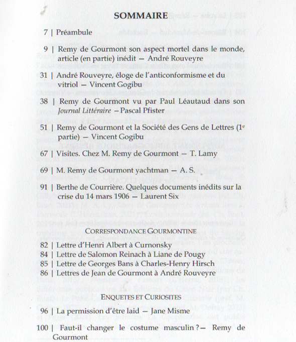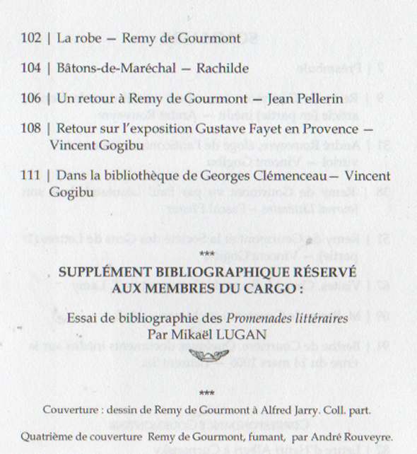 Illustration de couverture : portrait cubiste de Remy de Gourmont, par Annick Bouillon. Préambule Faire-part du décès de Remy de Gourmont Charles-Adolphe Cantacuzène : Les Réalités roses, sonnet Edouard Champion : Les Amis de 1914 Discours aux obsèques Lettres de Francis de Miomandre Bibliographie des articles nécrologiques CORRESPONDANCE GOURMONTINE, par Vincent Gogibu : Lettres à/de Jean de Gourmont (fin) Lettre inédite de Paul Claudel à Remy de Gourmont ENQUÊTES & CURIOSITÉS : Remy de Gourmont a cinquante ans, par Jean Florence Remy de Gourmont et la dissociation des idées, par Jean Florence Anatole France et Remy de Gourmont, par Michel Puy Remy de Gourmont philosophe, par Georges Palante Gourmont et les espérantistes, par Mikaël Lugan Causeries. Langues internationales, par Remy de Gourmont Retour sur la journée d'étude Paris VII-BNF du 3 avril LE VRAQUIER, par Christian BUAT NOTES DE LECTURE PARUTIONS *** SUPPLÉMENT BIBLIOGRAPHIQUE RÉSERVÉ AUX MEMBRES DU CARGO : REMY DE GOURMONT & LE MERCURE DE FRANCE V (1911-1915), par Mikaël Lugan N° 4. Automne 2013 Préambule REMY DE GOURMONT : La découverte de Stendhal REMY DE GOURMONT : Trois poèmes parus dans La Tradition MARIE-FRANCE DE PALACCIO : Remy de Gourmont et Han Ryner KEVIN SALIOU : Remy de Gourmont lecteur de Lautréamont NICOLE G. ALBERT : Le Satyre et l'Amazone DAMIEN FORTIN : Remy de Gourmont et La Fontaine SARAH AL MATARY : Une réponse de Normand : la contribution de Remy de Gourmont à la polémique sur les « races latines » ROMAIN ENRIQUEZ : Remy de Gourmont et les deux inconscients AURELIE BRIQUET: Les vers dans Sixtine : le « divertissement » d'un prosateur GERARD POULOUIN : Remy de Gourmont et les jardins CORRESPONDANCE GOURMONTINE : JEAN-MARC CANONGE : Remy de Gourmont « Paysan du Danube » Lettres à/de Jean de Gourmont (suite), par Vincent Gogibu REMY DE GOURMONT À L'ÉTRANGER : Ecrivains contemporains : Remy de Gourmont, par Sem Benelli (Thierry Gillybœuf, trad.) ENQUÊTES & CURIOSITÉS : Photo de famille Un portrait inédit, par C. C. Borth, par Damien GONNESSAT « Le fiasco symboliste », par Gaston et Georges COUTURAT La Physique de l'amour, par Raoul Narsy, présenté par Vincent GOGIBU La Toison d'or, avec un portrait de Jean de Gourmont par Frans de Geetere, par Francis de MIOMANDRE Jean de Gourmont et Corydon, Gide mafaiteur intellectuel ? présenté par Vincent GOGIBU A propos de deux envois d'André Gide à Remy de Gourmont, présenté par Vincent GOGIBU LE VRAQUIER, par Christian BUAT NOTES DE LECTURE PARUTIONS : Bibliographie sélective *** SUPPLÉMENT BIBLIOGRAPHIQUE RÉSERVÉ AUX MEMBRES DU CARGO : REMY DE GOURMONT & LE MERCURE DE FRANCE III (1901-1905), par Mikaël Lugan N° 3. Automne 2012 Préambule ERIC DUSSERT : Hommage à Bruno Leclercq REMY DE GOURMONT : Edgar Poe, ou « génie et folie » CHRISTIAN BUAT : Gourmont et l'idée de gloire TIZIANA GORUPPI : Gourmont dans la culture italienne au début du XXe siècle THIERRY GILLYBŒUF : Alias Rémy de Gourmont MAMADOU ABDOULAYE LY : Le dilettantisme critique dans le Livre des masques MIKAEL LUGAN : La Grande Encyclopédie REMY DE GOURMONT : Littérature américaine CORRESPONDANCE GOURMONTINE : Lettre inédite d'Emile Leroy de la BNF, par Vincent Gogibu Quelques lettres de Richard Aldington, par Thierry Gillybœuf Lettres à/de Jean de Gourmont (suite), par Vincent Gogibu GOURMONT À L'ÉTRANGER : Trois grands hommes de France (traduction de Mikaël Lugan) ENQUÊTES & CURIOSITÉS : Retour sur Cécile Sauvage, par Béatrice Marchal Roman inédit de Jean de Gourmont, par Vincent Gogibu Un poème de Jean de Gourmont Photo inédite de Jean de Gourmont Sur trois photograpies nouvelles de Remy de Gourmont Un portrait inédit de Remy de Gourmont ÉCHOS : La mort de Jean Moréas PARUTIONS : Bibliographie sélective *** SUPPLÉMENT BIBLIOGRAPHIQUE RÉSERVÉ AUX MEMBRES DU CARGO : REMY DE GOURMONT & LE MERCURE DE FRANCE II (1896-1900), par Mikaël Lugan N° 2. Automne 2011
